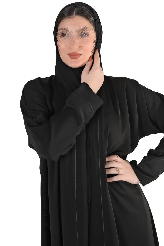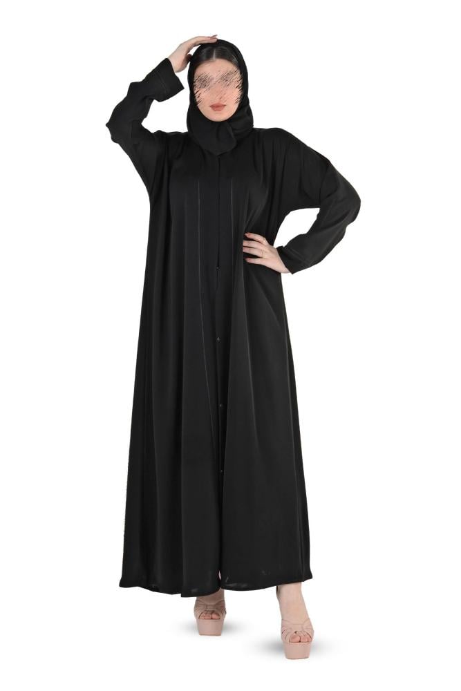 عباية سوداء أنيقة مطرزة من الامام بقيطان ناعم من اللون الاسود والاكمام صغيرة لاطلالة غاية في الفخامة والرقي. نوع القفلة طقطق لمزيد من السهولة في ارتداء العباية والحرية في الحركة