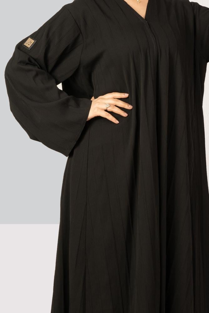 عباية سوداء بخامة الكريب وقصة كلوش فضفاضه رائعه والاكمام مربعه لمزيد من الراحه ومقلمه بالطول باللون الأسود لتصبح اكثر رقي